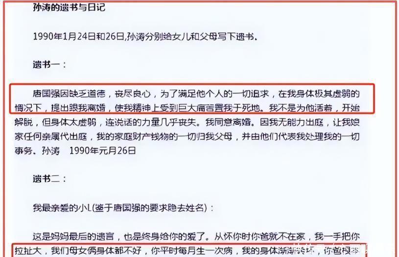 在遗书里,孙涛狠狠批评唐国强没有道德底线,完全丧失了良心。他在自己身体不舒服、虚弱的情况下,硬是坚持要离婚,让人觉得很失望。他坦率说自己精神崩溃,全都是他一手弄出来的。还特意叮嘱那年才7岁的女儿,长大以后得帮自己“讨回公道”。